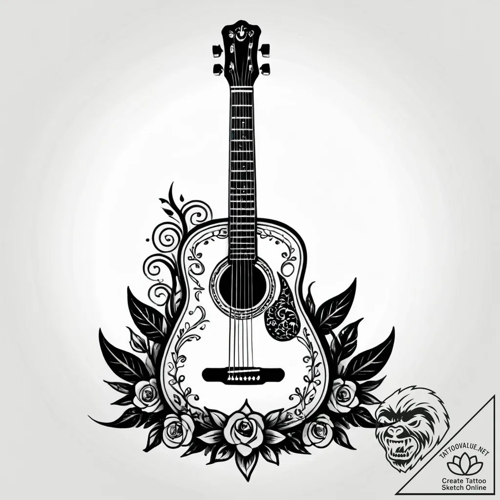 This striking blackwork design features a vintage acoustic guitar, its form accentuated by swirling, organic floral motifs and the stark contrast of bold black ink. Rendered with meticulous dotwork shading and a desaturated palette, it evokes the timeless allure of classic tattoo flash, a visual symphony of music and dark, decorative beauty.