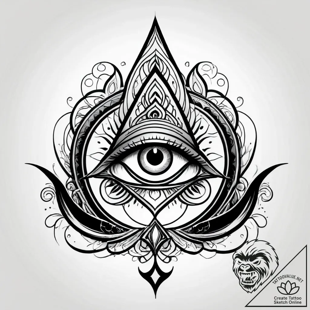 This striking tattoo sketch masterfully blends the enigmatic "Eye of Providence" with intricate mandala-like patterns, creating a powerful symbol of spiritual insight. Rendered in a photorealistic bla