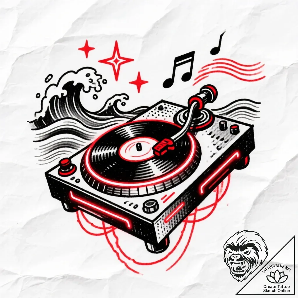 - Original User Request (RU): tat tattoo sketch, neon turntable glowing under moonlight with stars and gentle waves, cyber ocean music tattoo, tattoo drawing outline, trash polka tattoo style, black and red ink, collage-like, abstract realism, graphic elements, on a clean white paper, isolated, black and red ink, red accent, dramatic two-tone, soft whip shading, pepper shading, smooth dot shading