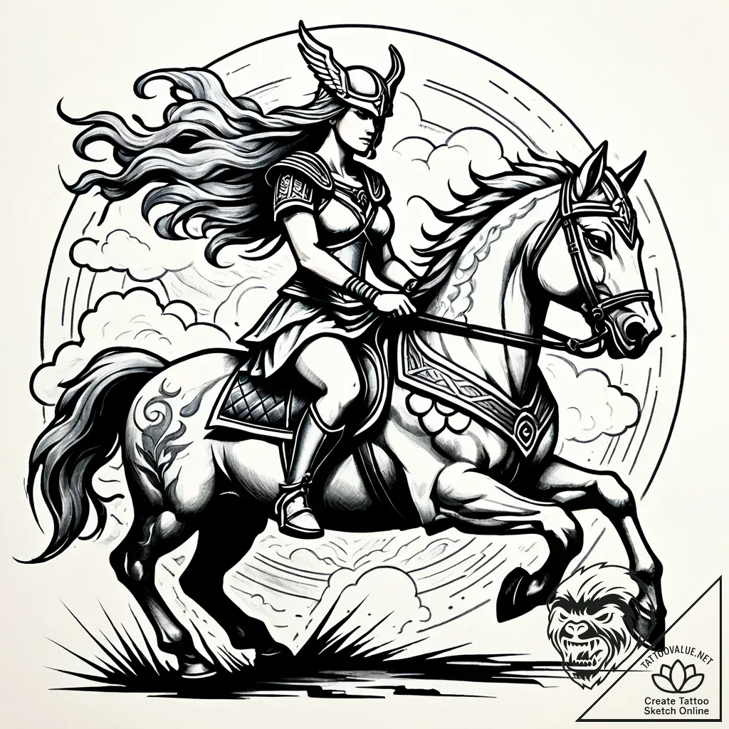 This striking tattoo sketch captures a Valkyrie, a celestial warrior, astride a powerful, armored horse, her mane a tempest of flowing lines against a backdrop of swirling storm clouds. The design emp