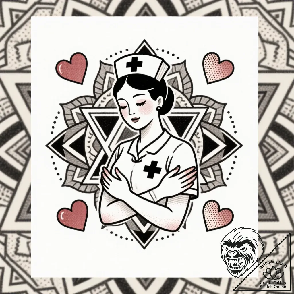 This tattoo sketch is a tender embrace of care, rendered in a refined geometric style. The central figure of a nurturing nurse, her silhouette softened by delicate shading and surrounded by ethereal hearts, evokes a sense of profound compassion. The intricate sacred geometry and mandala patterns act as a spiritual halo, amplifying the design's harmonious and protective aura.