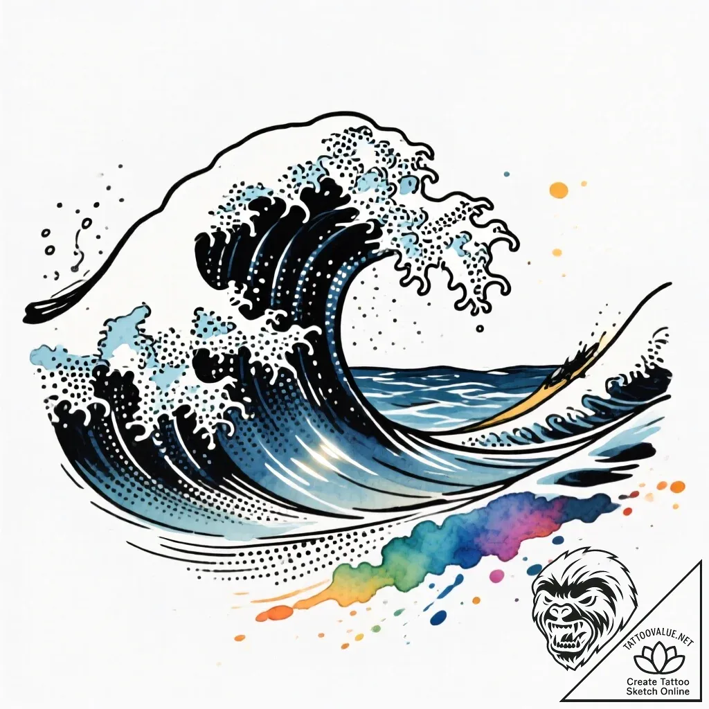 - Original User Request (RU): tat tattoo sketch, ocean waves curling with reflective light and sea spray, fluid motion tattoo, tattoo line art, dotwork shading, stippling texture, pointillism effect for tattoo, on a clean white paper, isolated, watercolor tattoo style, artistic splashes, vibrant blended colors, no outlines, abstract watercolor, black outline only, pure linework, no shading