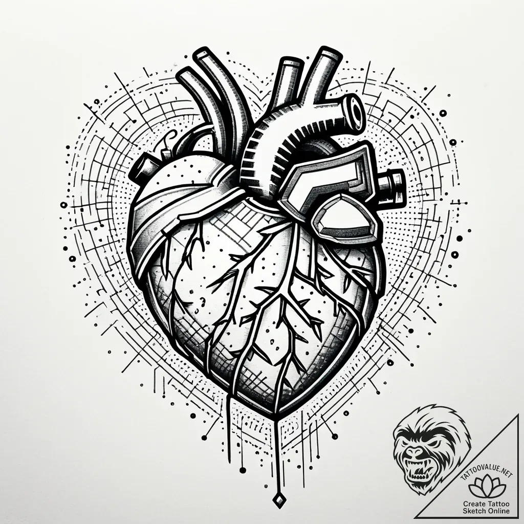 This striking sketch presents an anatomical heart, rendered with delicate linework and precise dotwork, as if it were a delicate piece of circuitry. The surrounding geometric patterns, reminiscent of