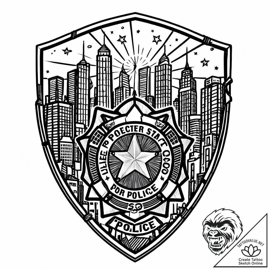 - Original User Request (RU): tat tattoo sketch, police shield with bright star and city skyline silhouette, urban protector tattoo, artistic tattoo sketch, rough sketchy lines, hand-drawn pencil sketch effect, artistic unfinished look, new school tattoo style, vibrant colors, cartoonish, graffiti art inspired, exaggerated forms, on a clean white paper, isolated, black and grey tattoo shading, smooth gradients