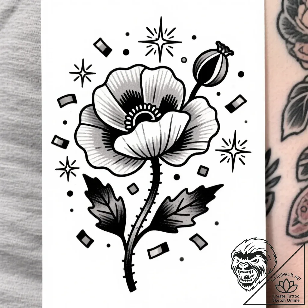 This classic American traditional tattoo sketch blossoms with a vibrant poppy, its petals unfurling like a joyful sigh amidst a shower of confetti and celestial sparkles. Rendered in a striking black