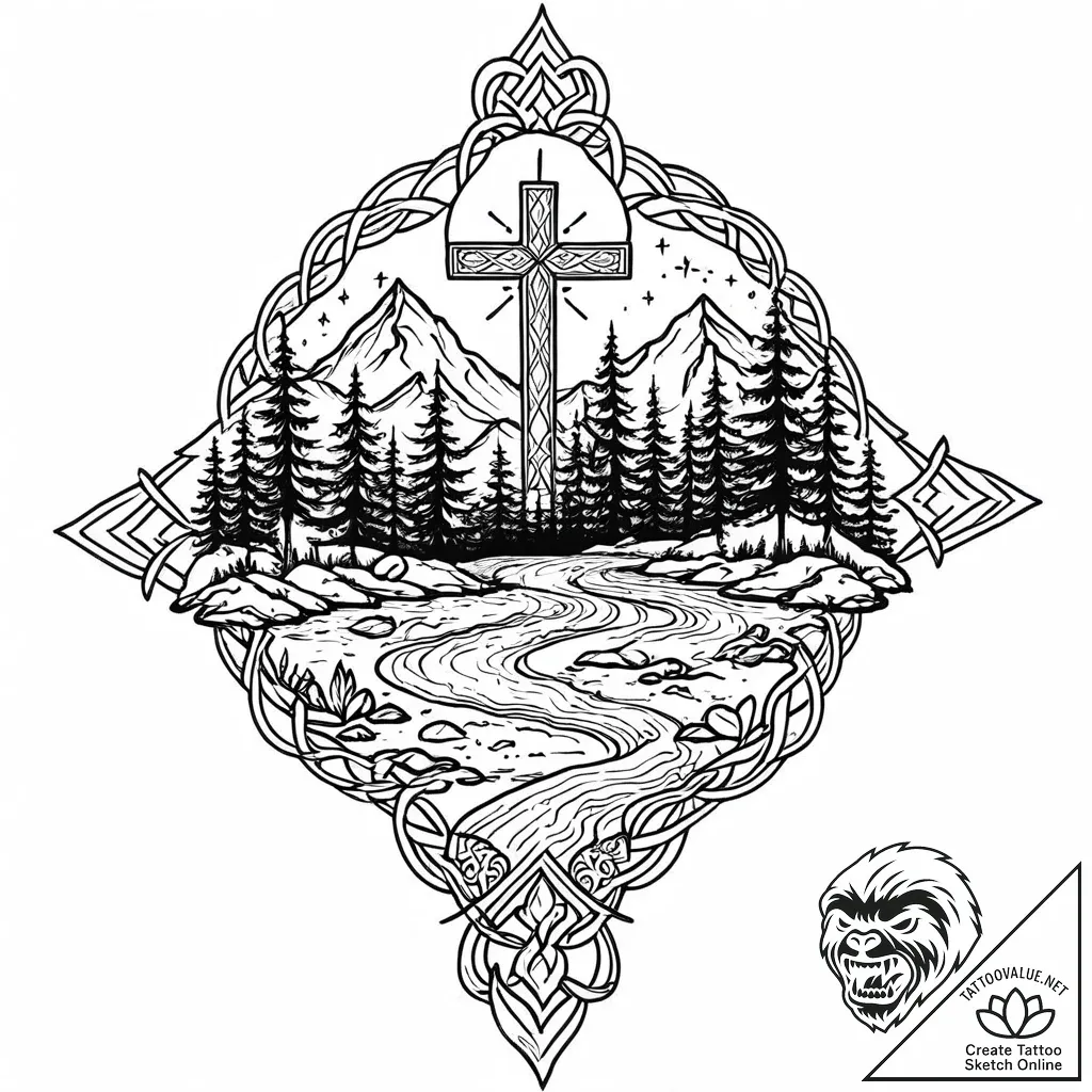 This tattoo sketch is a breathtaking fusion of the sacred and the natural world, rendered in a delicate yet bold linework style. A majestic cross rises like a beacon from a landscape of towering evergreens and a winding river, all cradled within an ornate, almost architectural frame reminiscent of Celtic knotwork. The sketch’s unfinished quality, with its rough lines and cross-hatching, lends it an authentic, hand-drawn feel, evoking a sense of raw spiritual energy.
