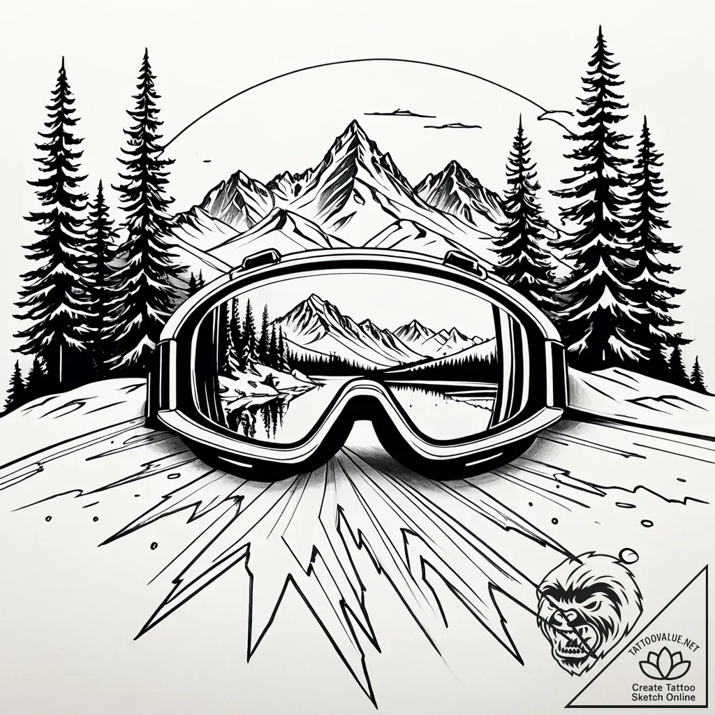 This striking tattoo sketch captures the essence of alpine adventure through the lens of a skier's goggles. The bold, graphic linework creates a high-contrast scene, mirroring the crisp clarity of a snow-covered landscape; jagged peaks and stoic pines are reflected within the goggles, suggesting a world both observed and experienced. The raw, unfinished quality of the sketch lends a sense of immediacy and untamed spirit, like a fleeting moment captured in ink.