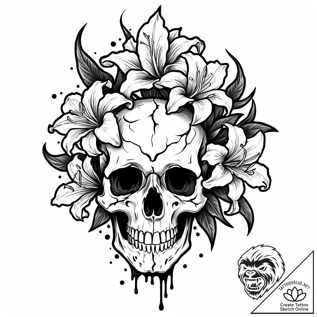 This striking sketch presents a skull, its fractures like ancient fissures, giving way to the delicate, blooming lilies that crown it. Rendered in a refined black and grey style, the piece utilizes sm