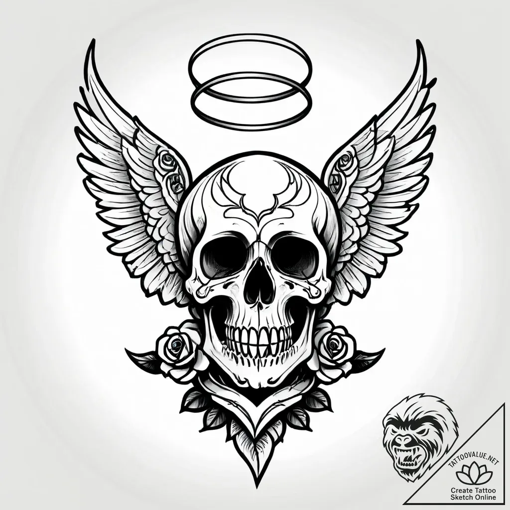 The skull symbolizes mortality and the ephemeral nature of life, while the angel wings and halos represent protection, guidance, and spiritual transcendence. The roses, often associated with love and beauty, add a layer of hope and remembrance, suggesting that even in the face of death, beauty and love can endure. This design can embody a profound acknowledgment of life's cycles and the enduring spirit.