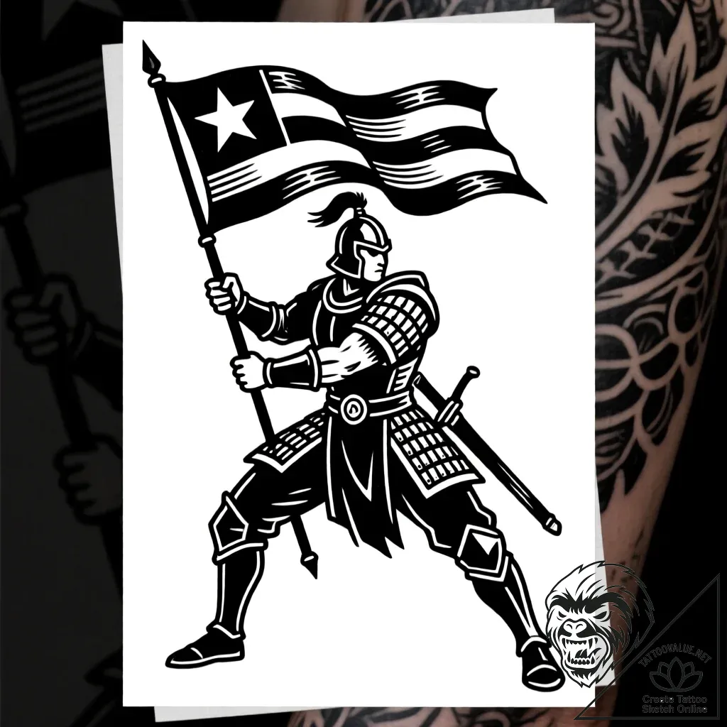 This blackwork tattoo sketch is a powerful embodiment of stoic resilience, a warrior frozen in a moment of unwavering resolve. The bold, heavy black outlines define the soldier's battle-ready stance and the proud, wind-swept flag, creating a stark, graphic image that speaks volumes through its simplicity and intensity.
