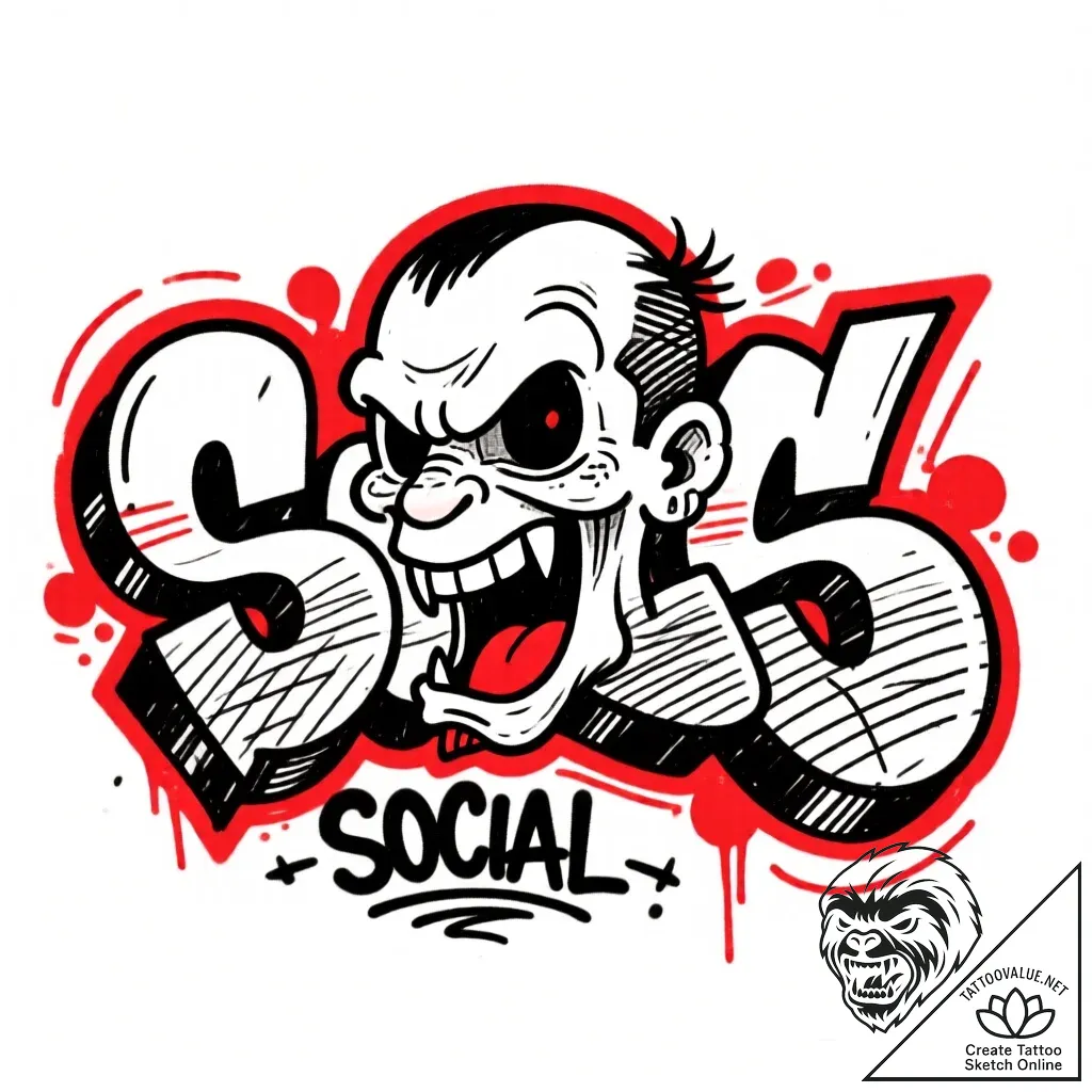 This striking New School tattoo sketch explodes with raw urban energy, a visual shout from the streets rendered in bold black and vibrant red. The cartoonish, exaggerated figure with glowing red eyes and sharp fangs, intertwined with graffiti-esque lettering, embodies a fierce, untamed spirit. Cross-hatching shading adds depth and texture, creating a powerful graphic statement that feels both chaotic and meticulously crafted.