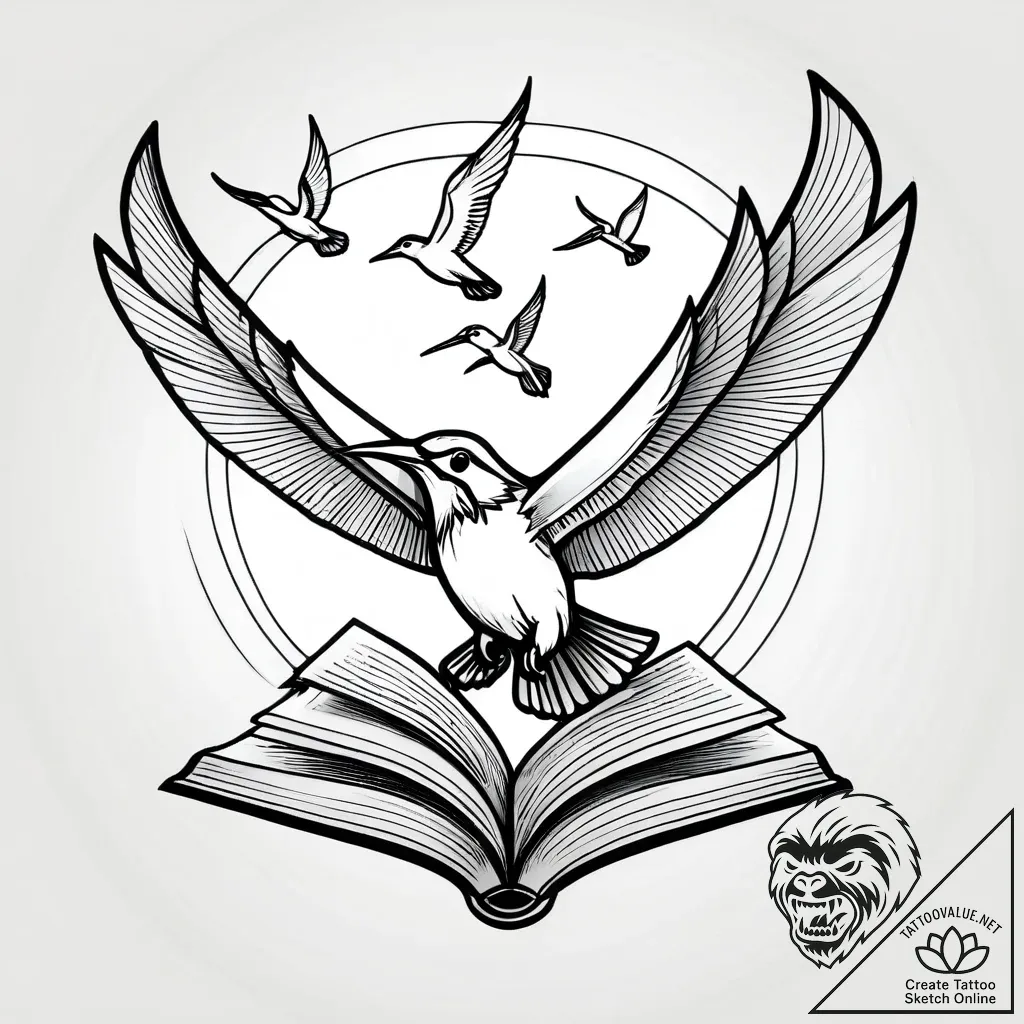- Original User Request (RU): tat tattoo sketch, teacher holding open book with flowing pages transforming into flying birds and letters, knowledge and inspiration tattoo, tattoo line art, sketch tattoo style, hand-drawn effect, rough lines, unfinished artistic look, cross-hatching, on a clean white paper, isolated, black outline only, pure linework, no shading, rough sketchy lines, hand-drawn pencil sketch effect, artistic unfinished look