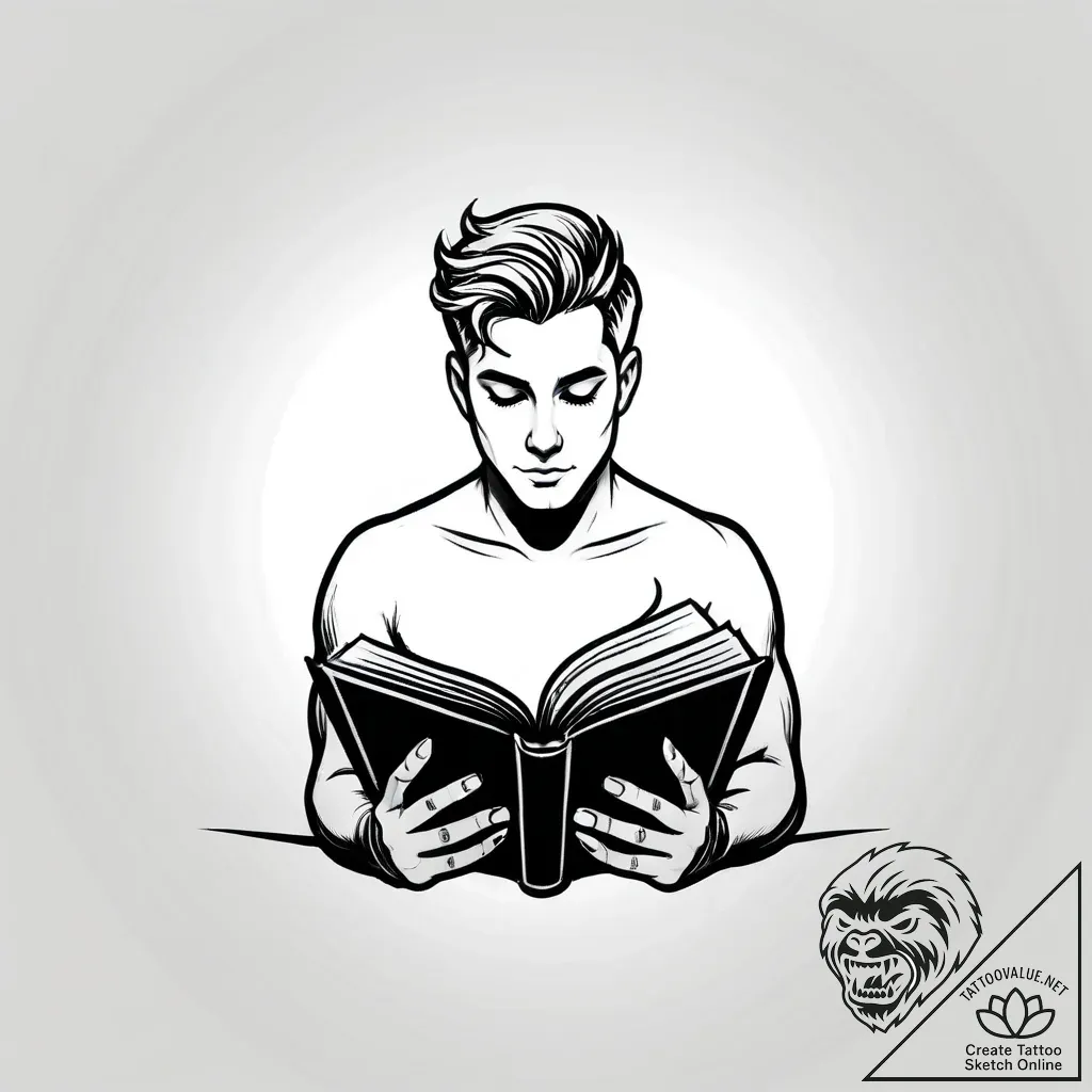 This black and grey linework tattoo sketch captures a moment of profound introspection, depicting a young man absorbed in an open book. The smooth gradients and crisp, single-needle lines create a sense of gentle illumination emanating from the pages, symbolizing enlightenment and intellectual pursuit. The clean, graphic style emphasizes the purity of the act of reading, presenting a hopeful and serene composition.