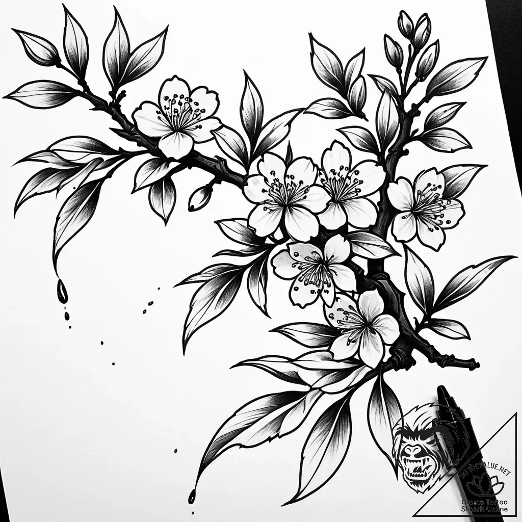 - Original User Request (RU): tat tattoo sketch, traditional japanese cherry blossom branch with falling petals, elegant ink, tattoo sketch design, on a clean white paper, isolated, detailed cross-hatching shading, pen and ink hatching, black and white sketch, monochrome, greyscale tones, blackwork tattoo style, dark art, bold black areas, heavy black ink