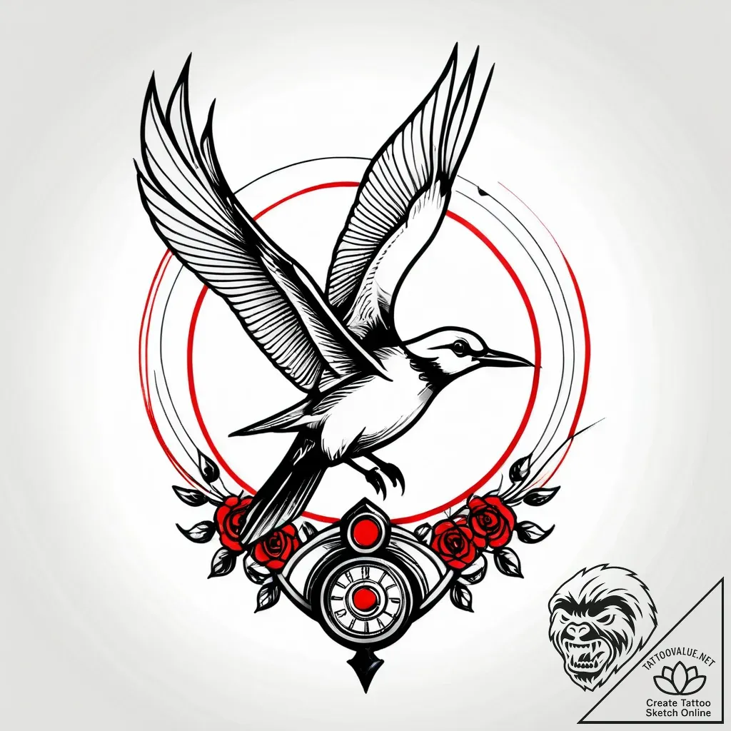 This neo-traditional sketch masterfully blends the delicate grace of a bird in flight with the stark symbolism of typewriter keys. Rendered in a dramatic two-tone palette of black and striking red ac