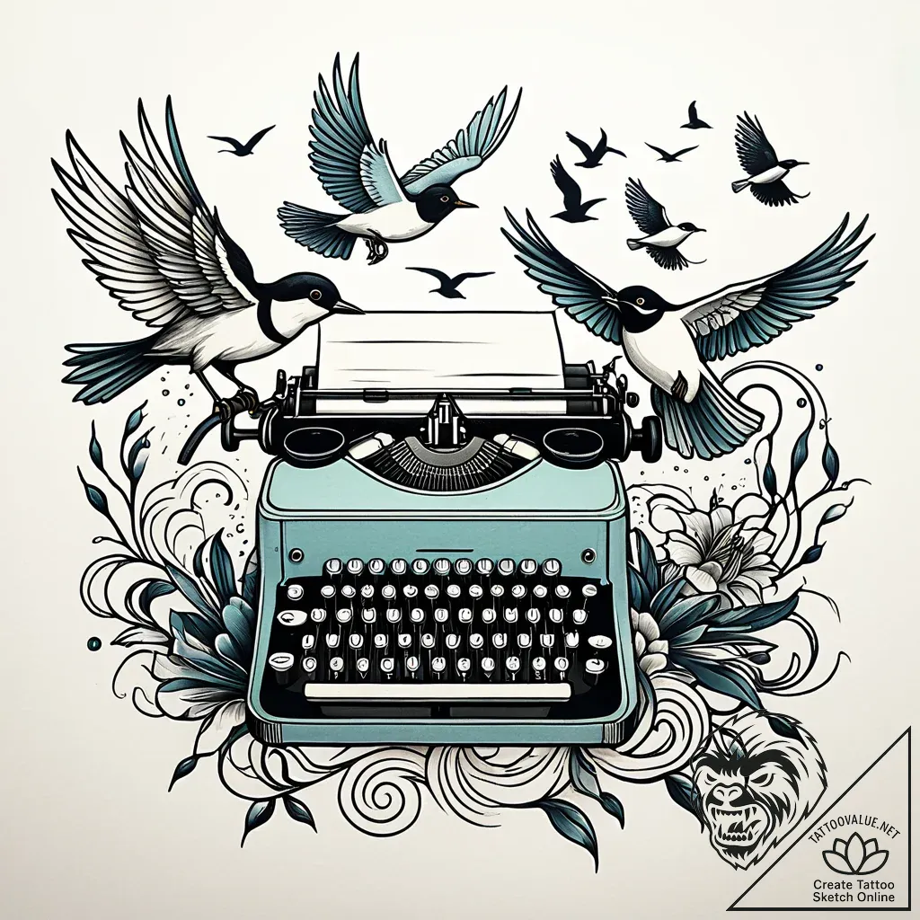 - Original User Request (RU): tat tattoo sketch, typewriter transforming into flock of birds flying over ocean, imaginative freedom tattoo, tattoo line art, on a clean white paper, isolated, muted color palette, desaturated colors, vintage tattoo feel, bold outlines, thick lines, heavy linework, neo traditional tattoo, illustrative, art nouveau influence, detailed, rich colors