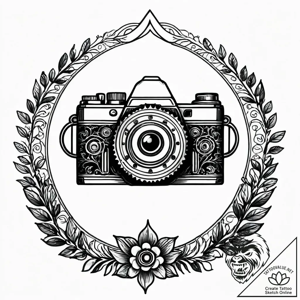 The vintage camera symbolizes the art of capturing moments, preserving memories, and a deep appreciation for history and the tangible past. The surrounding floral frame and classic elements speak to enduring beauty, growth, and the timeless nature of significant experiences. This tattoo can represent a profound connection to personal history, a love for photography, or the desire to hold onto precious memories with a touch of old-school soul.