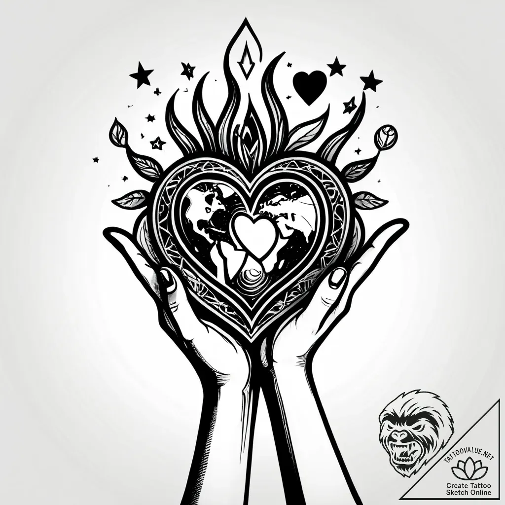 - Original User Request (RU): tat tattoo sketch, volunteer hands holding heart and earth with glowing aura, compassion and hope tattoo, tattoo sketch design, trash polka tattoo style, black and red ink, collage-like, abstract realism, graphic elements, bold outlines, thick lines, heavy linework, on a clean white paper, isolated, black and red ink, red accent, dramatic two-tone
