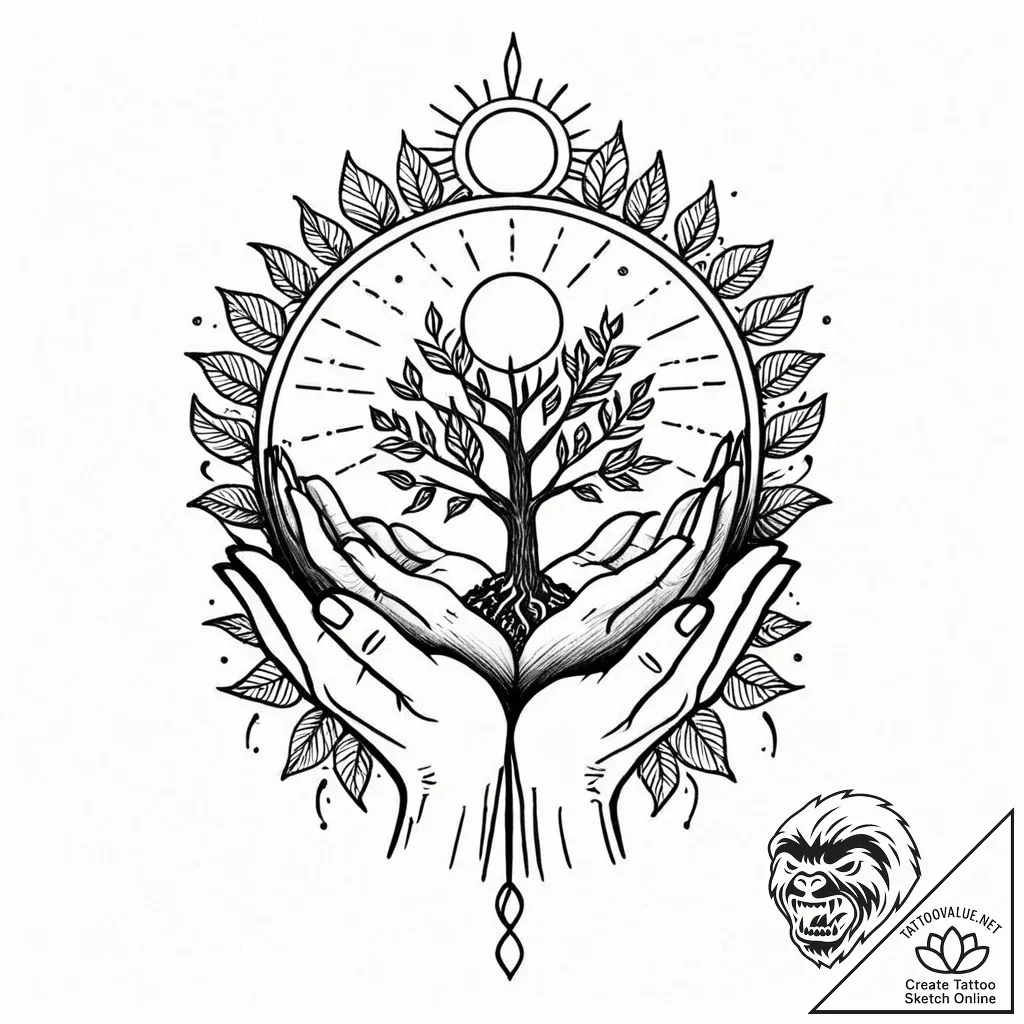 This design is a profound symbol of life, growth, and our connection to the planet, embodying hope, compassion, and the act of creation. The tree represents resilience and the cyclical nature of life, while the nurturing hands signify care, responsibility, and the power of individual action. The sun and moon symbolize balance and the continuous flow of energy, making this tattoo a statement of one's commitment to fostering growth and positive change.