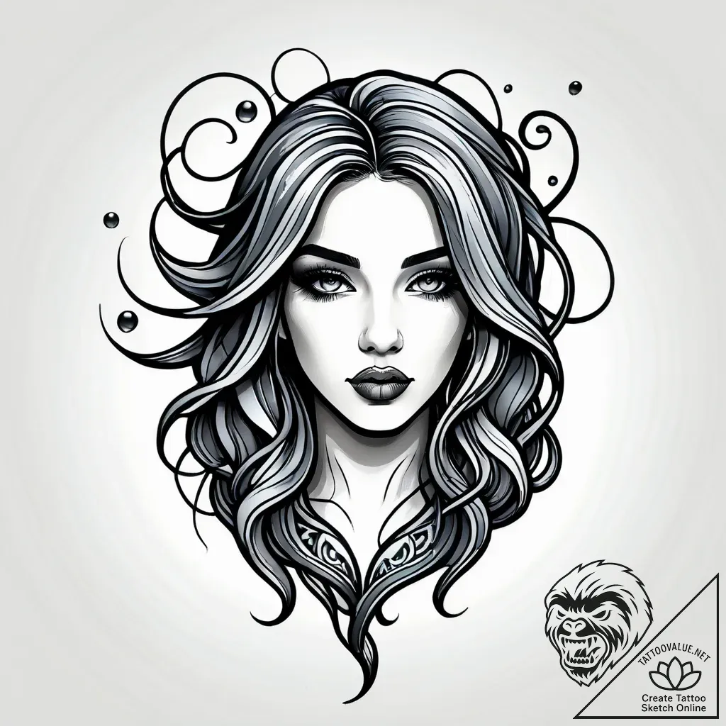 This striking black and grey sketch captures a feminine water elemental, her hair cascading like ethereal waterfalls, adorned with swirling patterns reminiscent of oceanic currents. The art style blends the clean lines and exaggerated forms of new school tattoo art with a graffiti-inspired dynamism, creating a piece that is both soft and powerful, with smooth gradients that evoke the fluidity of water.