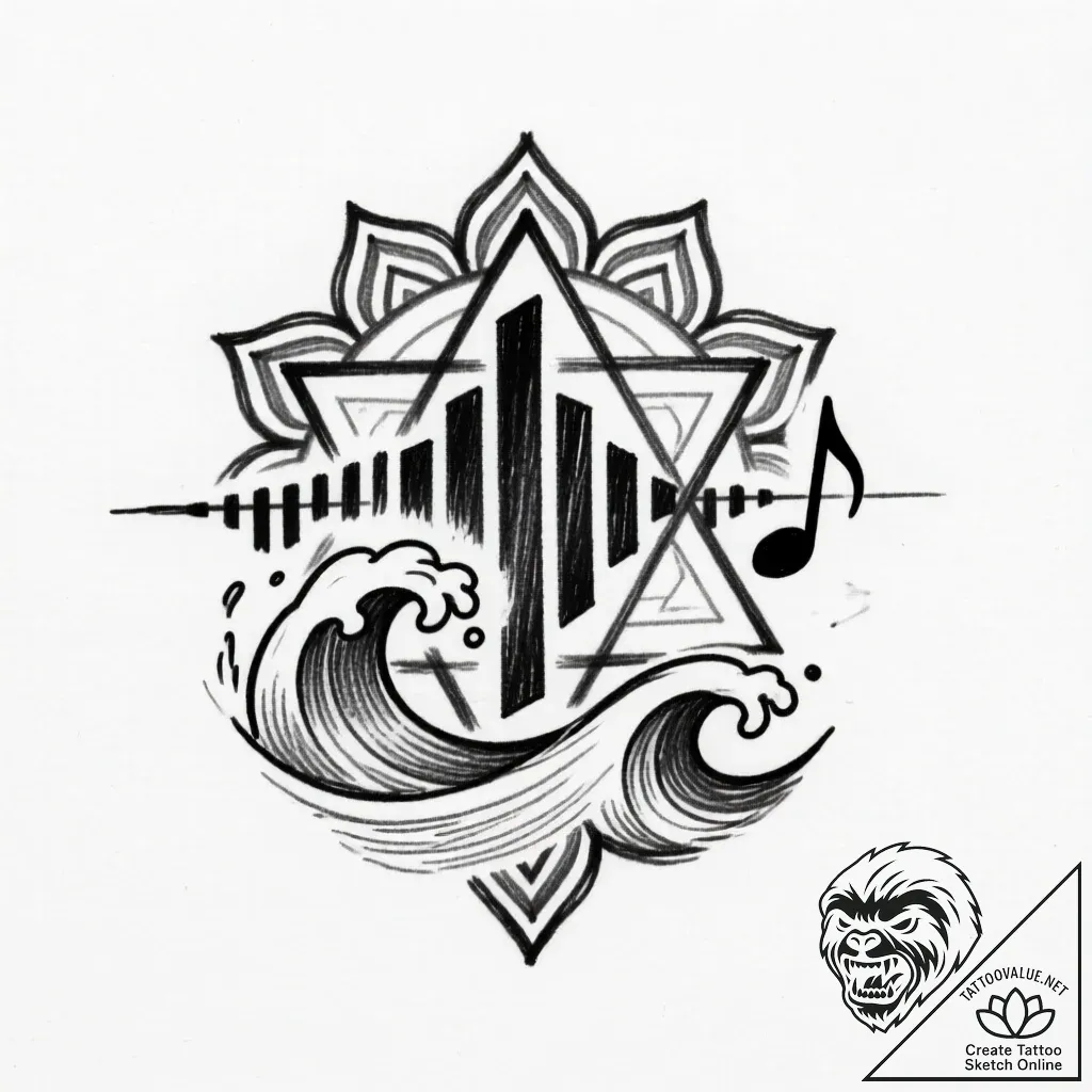 This design embodies the fusion of the primal forces of nature (waves) with the structured beauty of sound and spiritual order (sound bars, sacred geometry). It speaks to the power of rhythm and flow, suggesting a deep connection to the universal vibrations that connect all things. This tattoo can symbolize a passion for music, a profound respect for nature's cycles, and a desire to live in balance with the world's inherent energies.