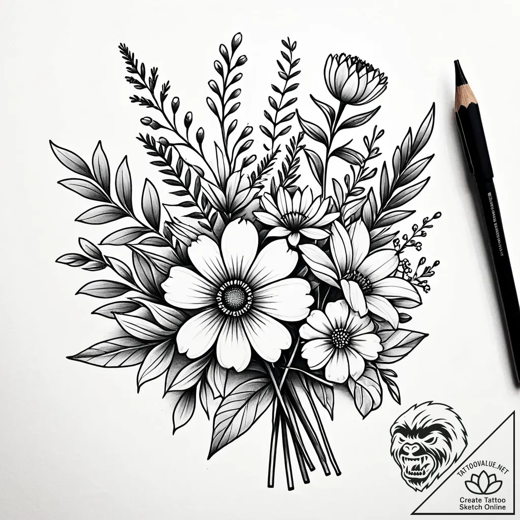 A wildflower bouquet symbolizes untamed beauty, resilience, and the joy found in simple things, reflecting a free spirit and an appreciation for nature's artistry. This tattoo can represent a connection to the earth, personal growth, or the celebration of life's natural, uncultivated moments.