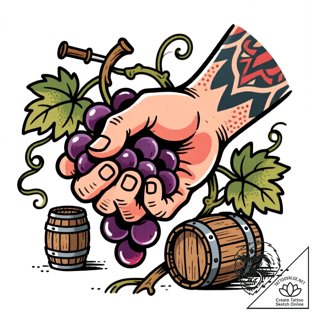 • Original User Request (RU): tat tattoo sketch, winemaker’s hand crushing grapes with detailed vines and barrels behind, artisan craft tattoo, concept art for tattoo, vibrant colors, full color spectrum, bold bright tattoo inks, new school tattoo style, vibrant colors, cartoonish, graffiti art inspired, exaggerated forms, soft whip shading, pepper shading, smooth dot shading, on a clean white paper, isolated