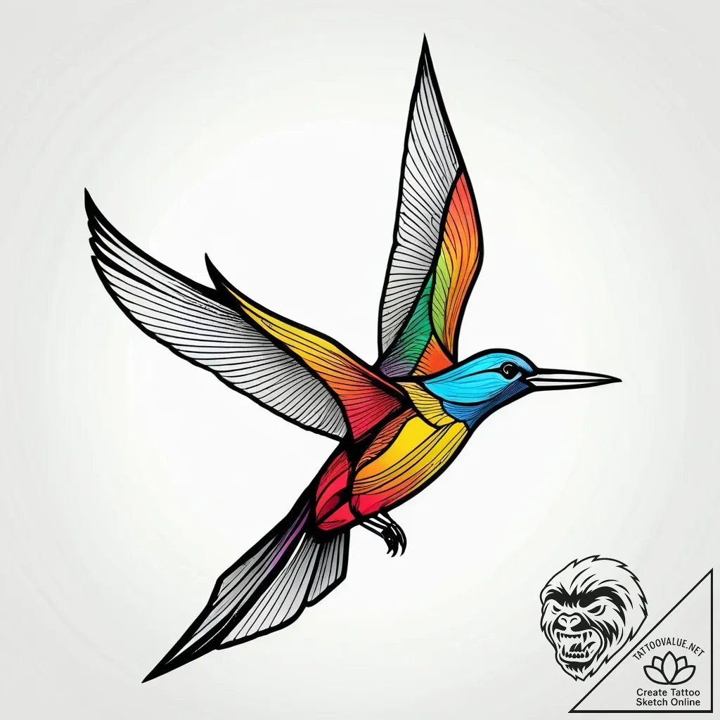 This striking linework tattoo sketch captures a hummingbird in mid-flight, its body erupting from the pages of an unseen book. The design employs clean, fine lines and bold outlines with vibrant, full-spectrum colors, creating a dynamic visual narrative of transformation and boundless spirit.