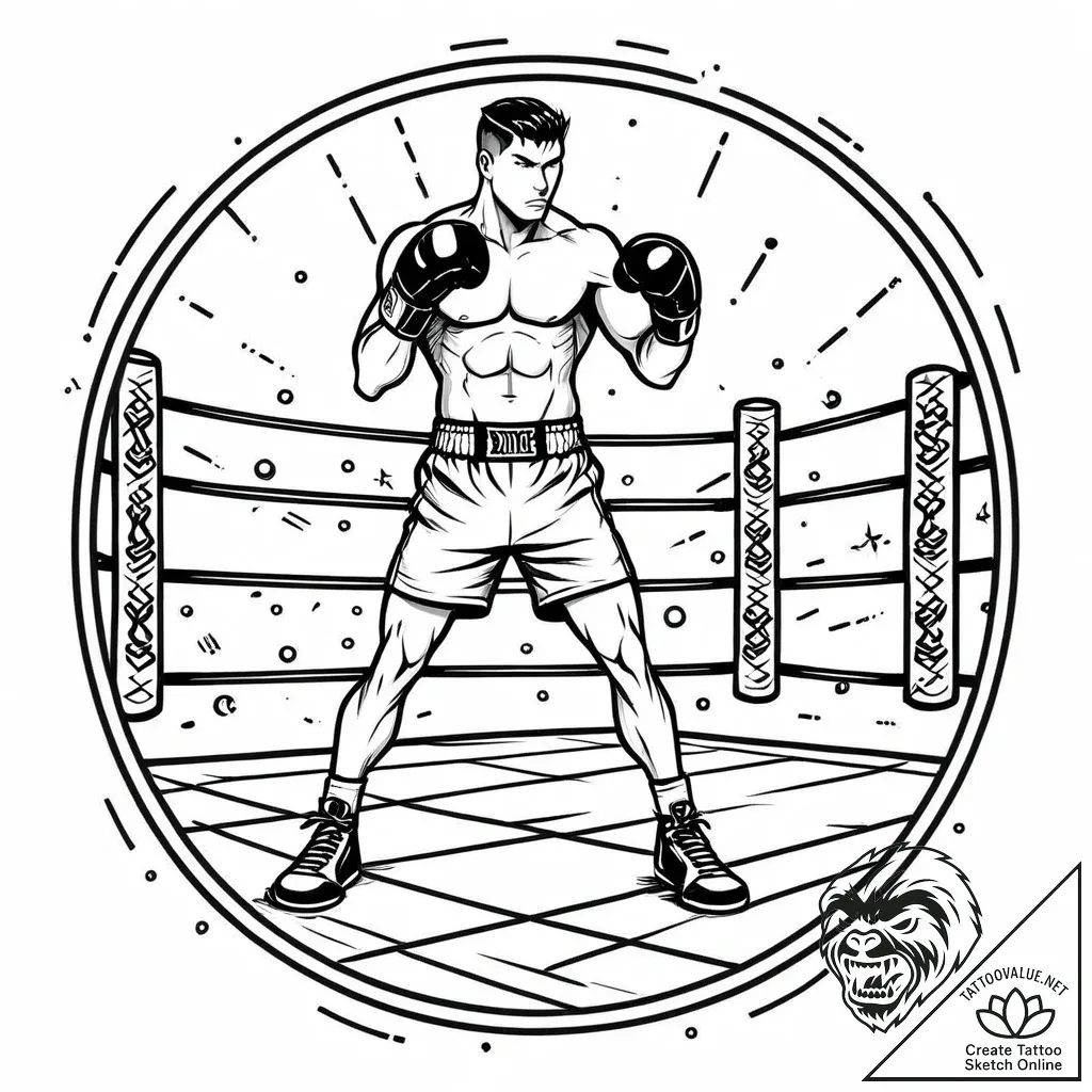 This striking linework tattoo sketch captures a powerful boxer poised in the center of the ring, a testament to raw determination. Rendered with clean, fine black outlines only, the design evokes a sense of classic graphic art, with dynamic lines creating a palpable energy within the circular composition. The absence of shading amplifies the stark, focused intensity of the scene.