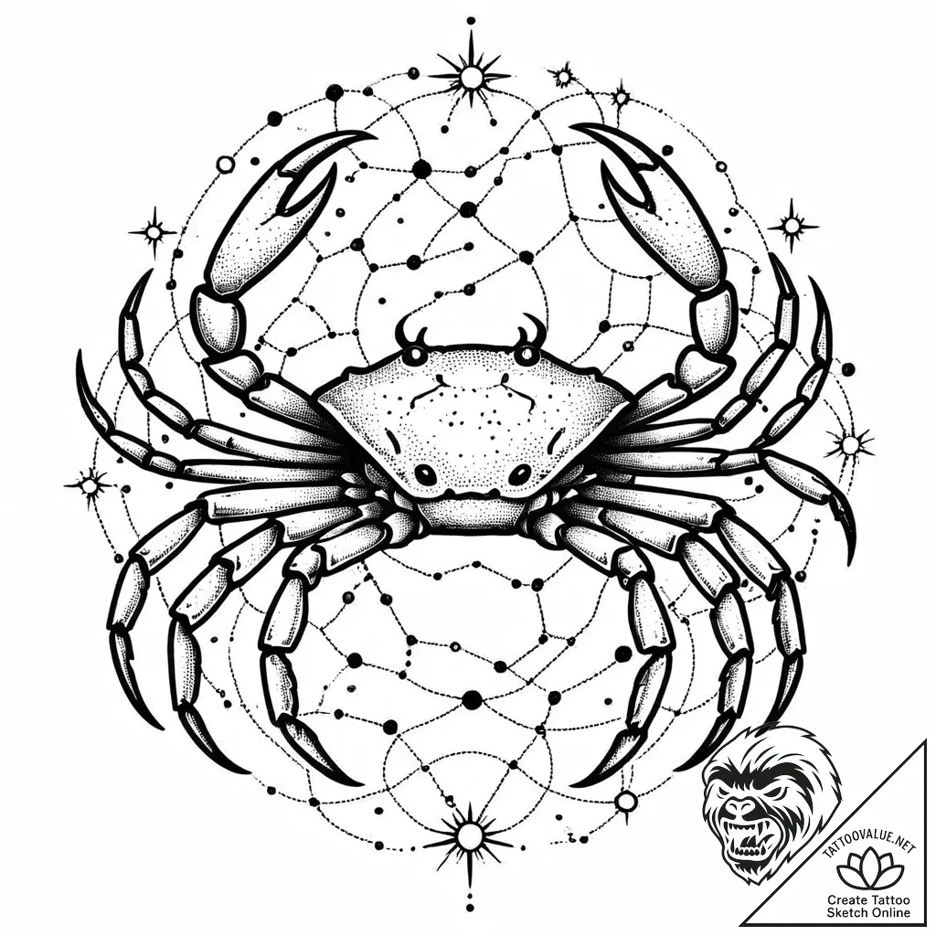 This tattoo sketch is a celestial masterpiece, a graphic portrayal of the Cancer constellation rendered with ethereal stars as tiny, shimmering crabs. The design is steeped in a vintage tattoo aesthet