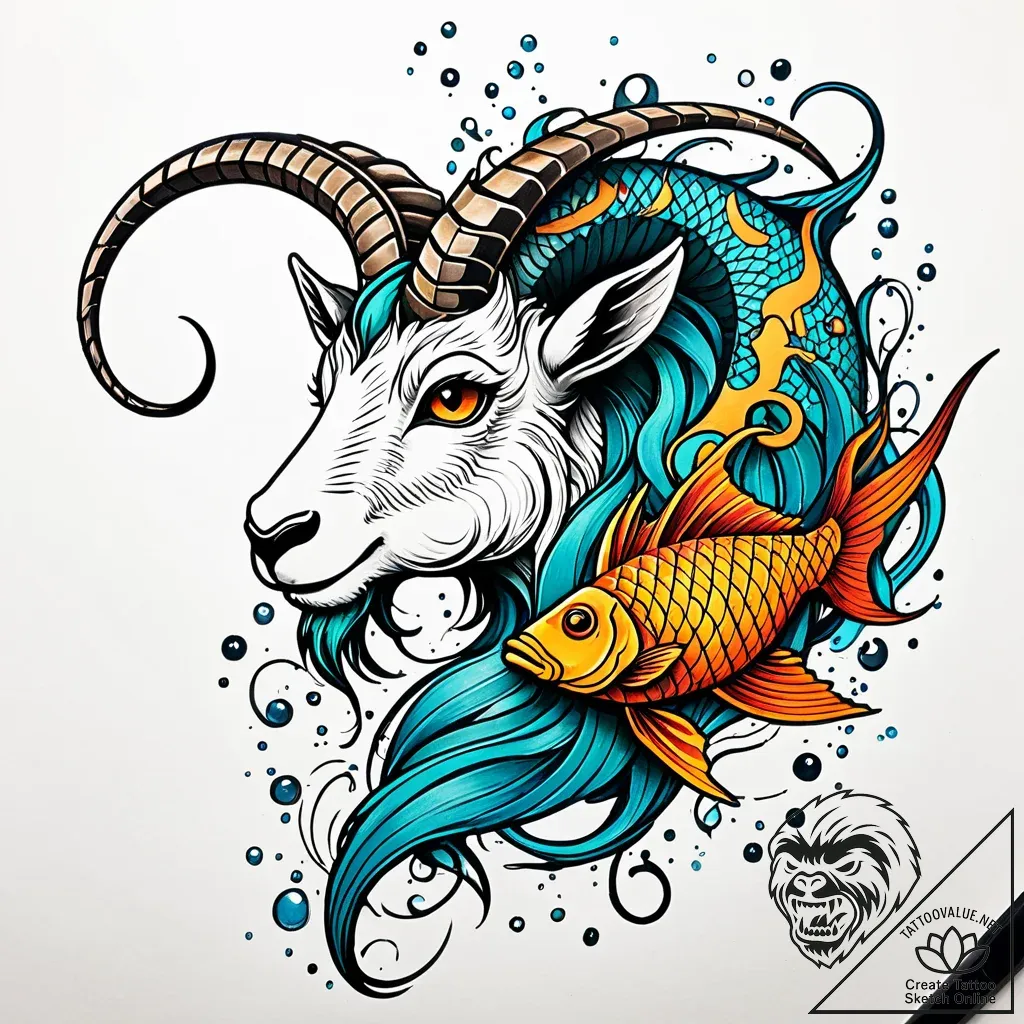 - Original User Request (RU): tattoo design a capricorn goat-fish, half covered in earthy textures, half in scales and water splashes., tattoo sketch design, new school tattoo style, vibrant colors, cartoonish, graffiti art inspired, exaggerated forms, fine lines, delicate linework, single needle style, on a clean white paper, isolated, black outline only, pure linework, no shading