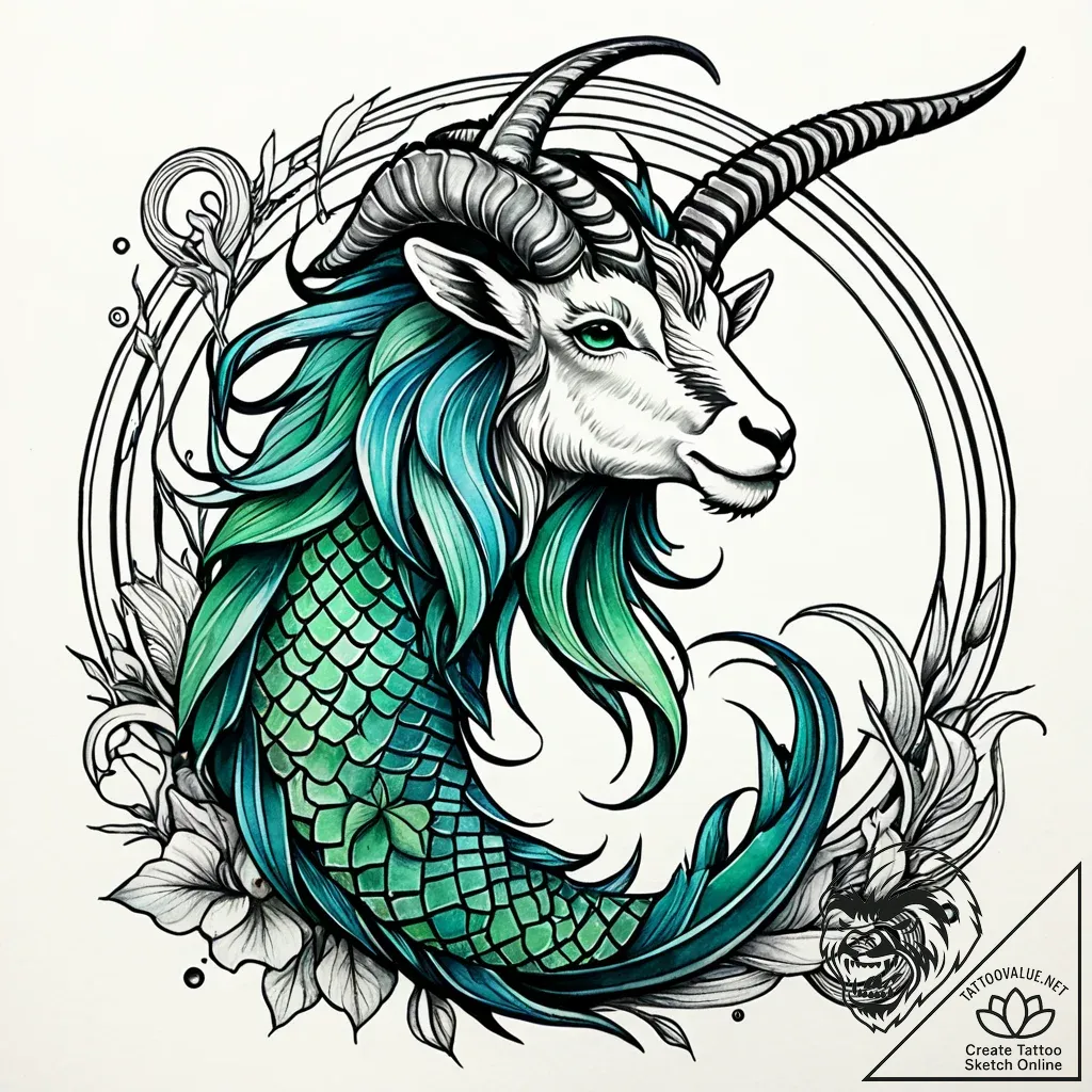 This Neo-traditional Capricorn design is a captivating fusion of terrestrial ambition and oceanic depth, rendered with bold, illustrative linework. The creature's formidable horns and intelligent gaze are softened by the flowing, watercolor-esque blend of earthy greens and oceanic blues that cascade into its serpentine, scaled lower body, evoking a powerful, mythic presence.