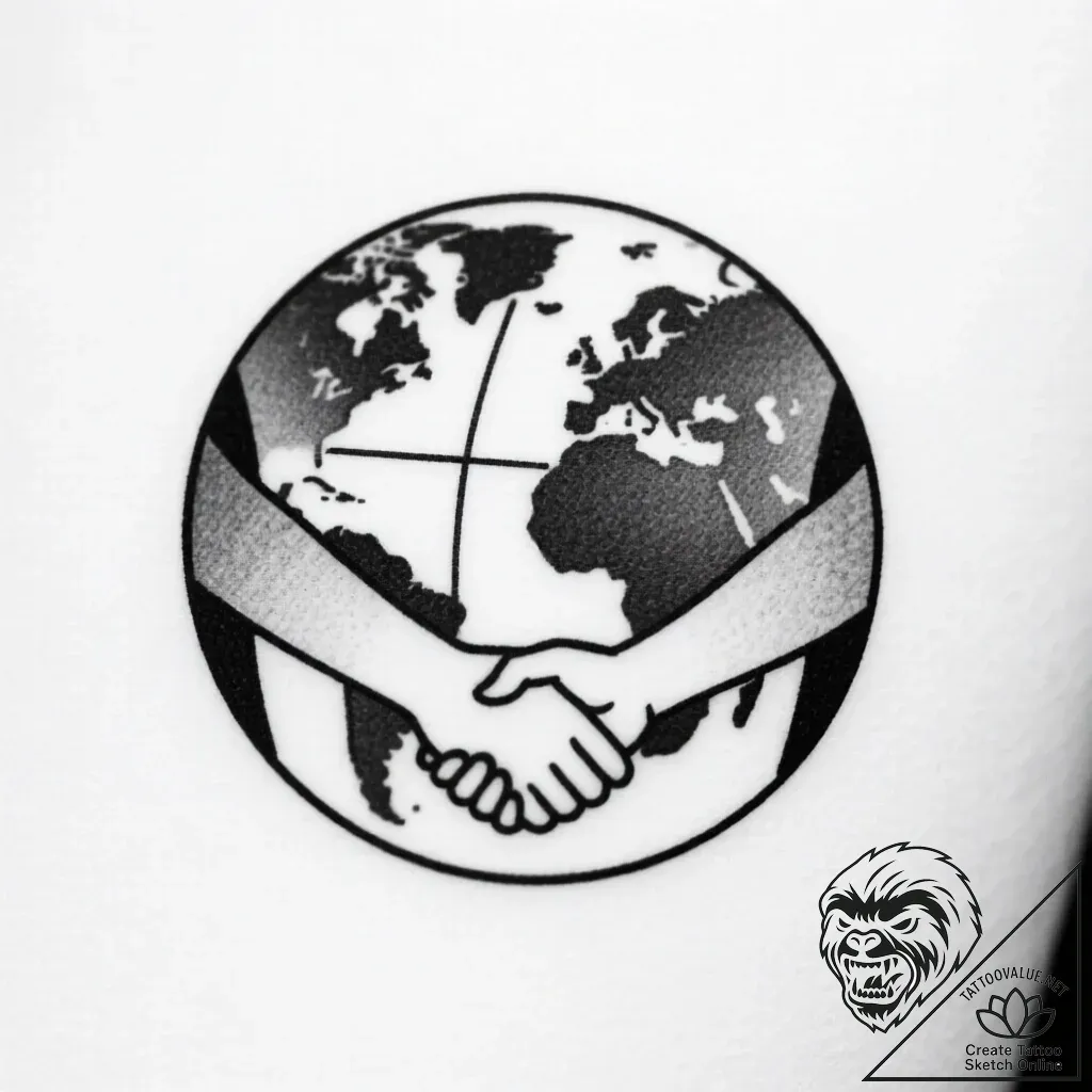 This tattoo symbolizes global unity, shared responsibility, and the interconnectedness of all people. It speaks to a sense of collective duty towards our planet and each other, embodying values of peace, cooperation, and universal understanding. This design can emphasize a person's commitment to global citizenship and their belief in a harmonious world.