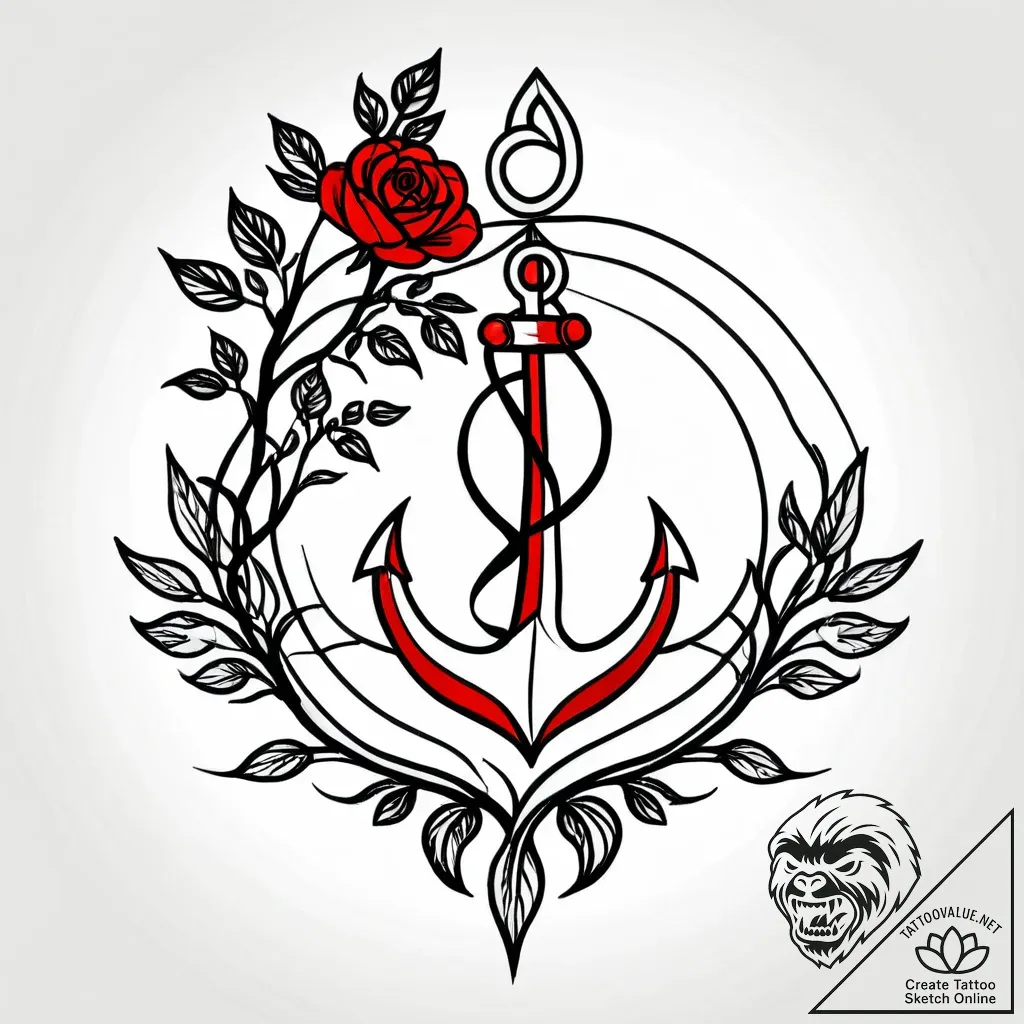 This American Traditional sketch masterfully blends the stoic strength of an anchor with the ephemeral beauty of a rose. The bold black linework, characteristic of classic sailor tattoos, is punctuated by a vibrant red accent on the anchor and a single crimson rose, creating a dramatic and timeless contrast. The composition feels grounded and rooted, yet elegantly framed by delicate, intertwining branches, evoking a sense of enduring passion and stability.