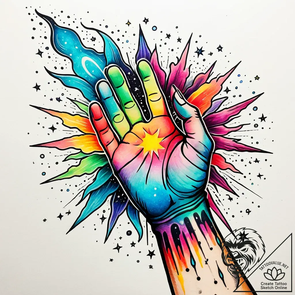 This American Traditional tattoo sketch is a vibrant explosion of cosmic energy, featuring a hand reaching towards a radiant nebula depicted with bold, classic lines and a dazzling spectrum of colors.