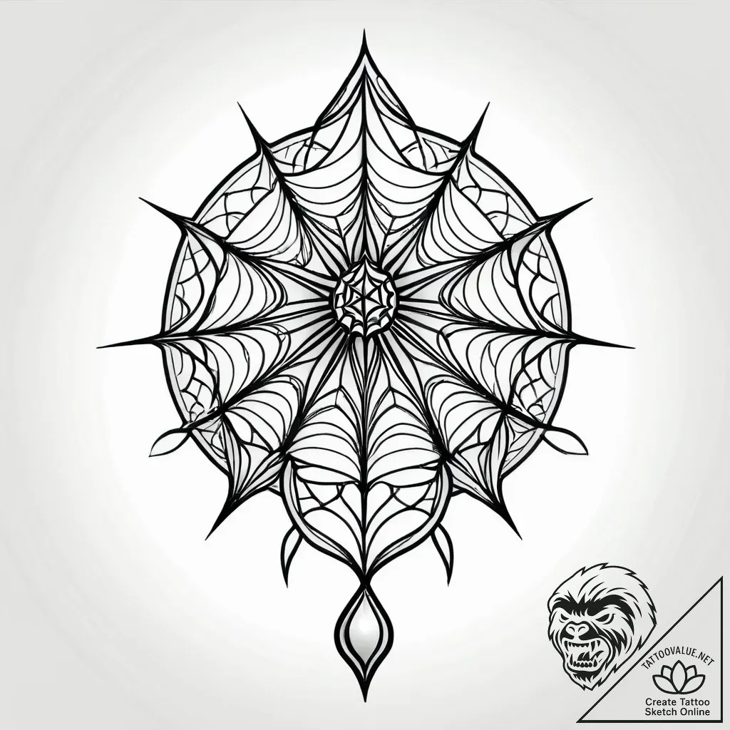 This intricate spiderweb sketch is a delicate yet bold piece, reminiscent of classic sailor tattoos. The design unfurls like a celestial bloom, with sharp points radiating outwards and graceful curve