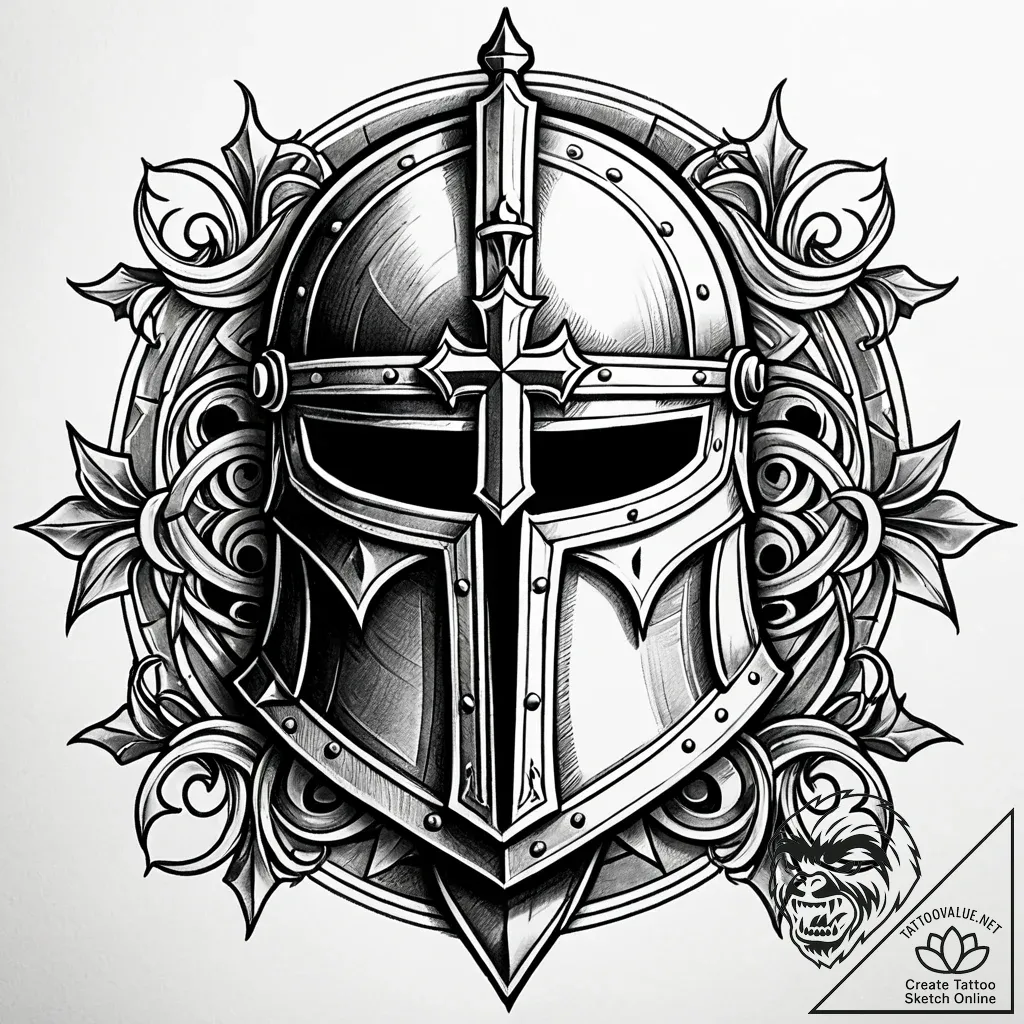 This neo-traditional tattoo sketch is a powerful visual narrative, evoking the stoic resilience of a medieval knight. The helmet, rendered with meticulous cross-hatching and bold, hand-drawn lines, stands as a sentinel, its metallic sheen captured through masterful greyscale tones. Encircling it, ornate scrollwork and sharp, stylized foliage create a dynamic halo, hinting at both protective strength and an enduring legacy.