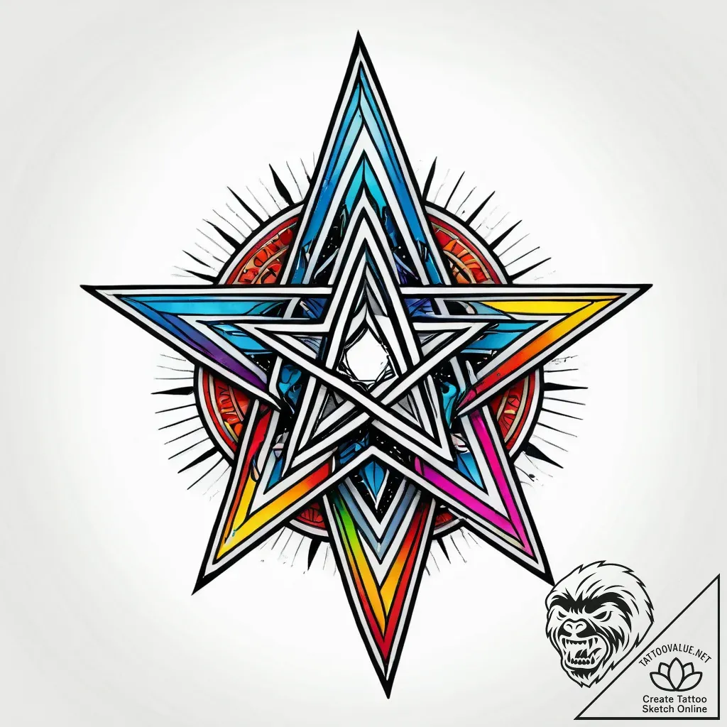 This tattoo sketch explodes with celestial energy, a falling star rendered in the full spectrum of color, contained within a bold, geometric starburst. The design marries the classic aesthetic of American Traditional with a modern, kaleidoscopic vibrancy, creating a dynamic interplay of sharp lines and saturated hues. It feels like a captured moment of cosmic grace, a fleeting wish frozen in ink.