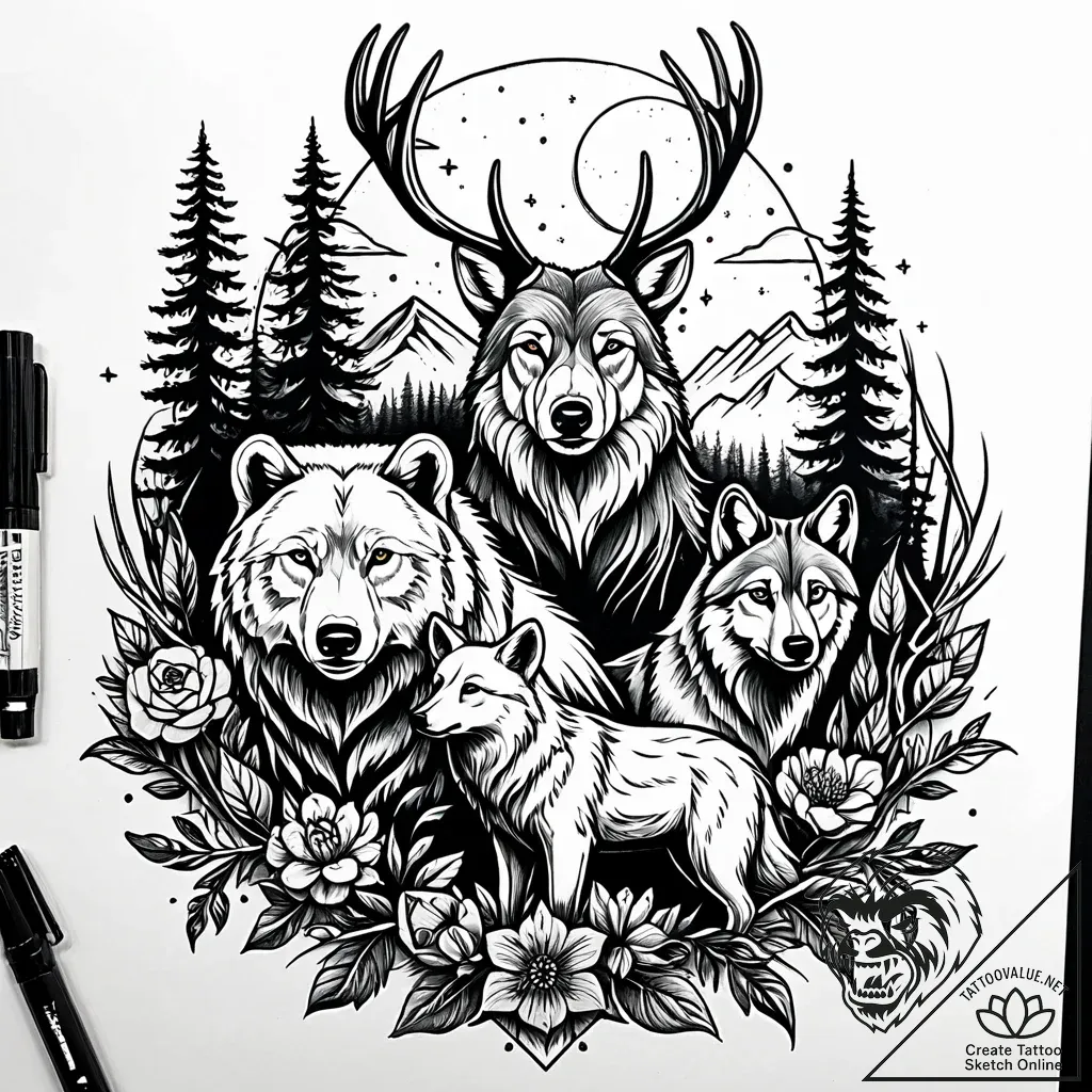• Final Prompt for AI (EN): tattoo sketch, tattoo design, isolated tattoo sketch on pure white background, family of animals tattoo design, bears, wolves, deer, natural setting, ink illustration, clean white paper, isolated, black outline only, pure linework, no shading, detailed cross-hatching, pen and ink hatching, blackwork tattoo style, dark art, bold black areas, heavy black ink