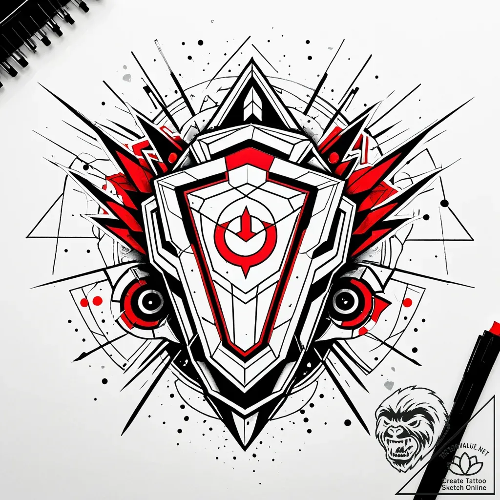 This dynamic design explodes with graphic intensity, a fusion of cybernetic precision and raw, tribal energy. The central shield, rendered with bold, thick linework and stark black and red contrast, m