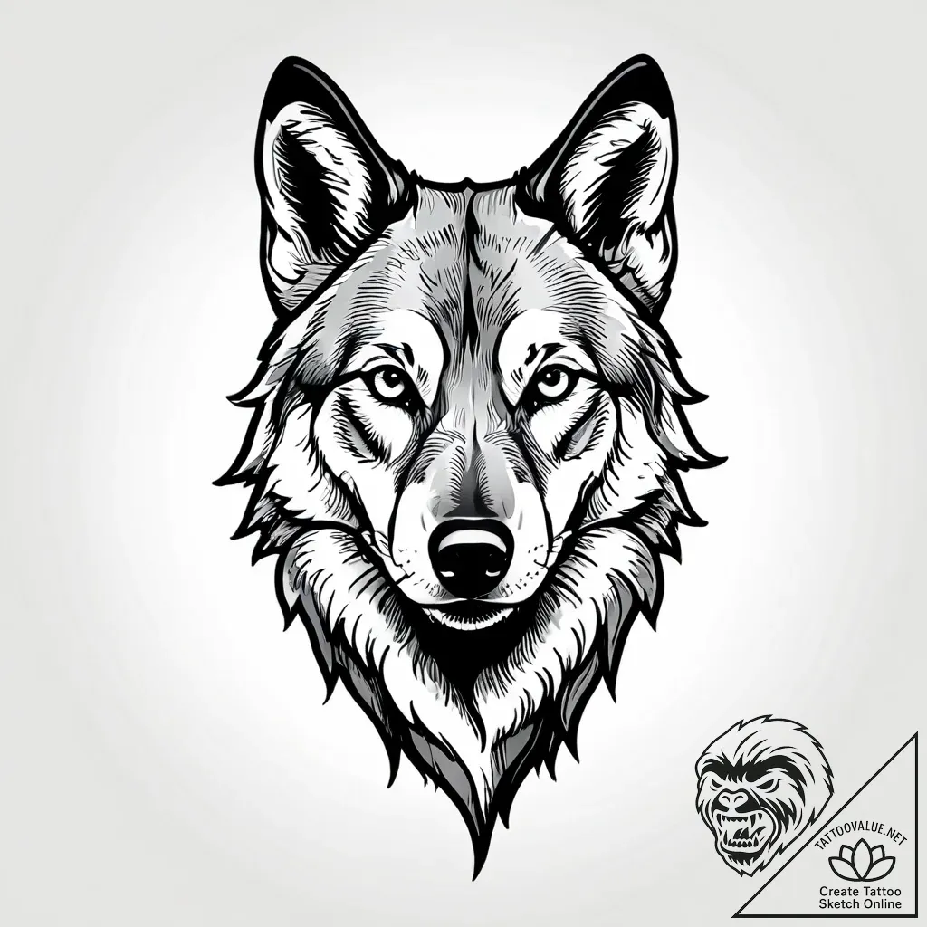 This stark blackwork sketch captures a lone wolf's gaze, its eyes like twin embers piercing the void. Rendered with sharp, clean linework, the wolf's form emerges from the white space like a primal whisper, its dense fur defined by bold black areas and crisp outlines that speak of untamed power.