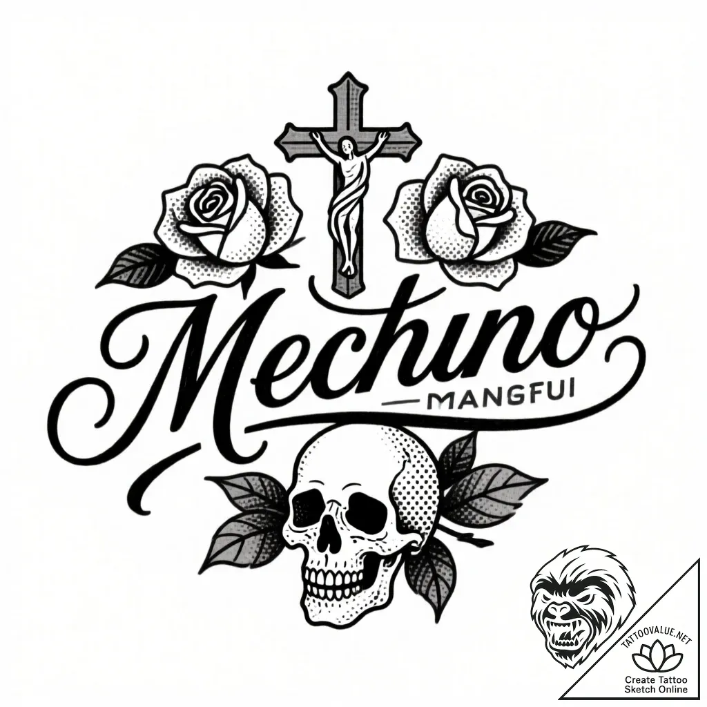 • Final Prompt for AI (EN): tattoo sketch, tattoo design, isolated tattoo sketch on pure white background, A chicano tattoo design concept, featuring elegant script lettering of a meaningful word, integrated with religious iconography, roses, and skulls. The style is fine line black and grey, rendered as a monochrome, greyscale sketch on clean white paper, isolated. Emphasize dotwork shading and stippling texture for a pointillism effect, creating a sophisticated and symbolic tattoo art piece.