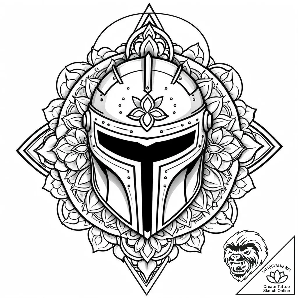 The knight's helmet is a potent symbol of protection, courage, and unwavering honor, a bastion against the adversities of life. Intertwined with the mandala, which represents unity, balance, and the infinite universe, this design signifies a harmonious blend of outward defense and inner spiritual discipline, embodying a character of resolute integrity and profound self-awareness.
