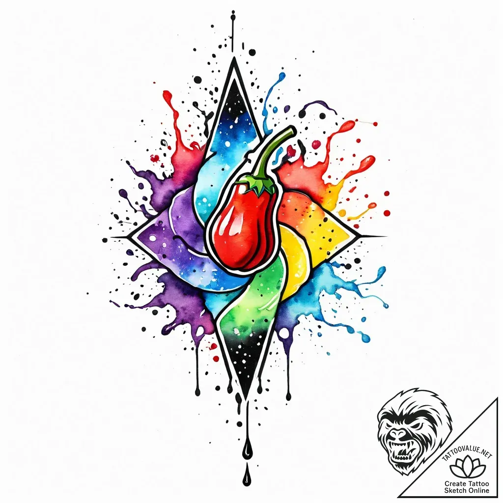 This vibrant watercolor tattoo sketch bursts with life, featuring a bold red chili pepper at its core, like a fiery heart within a celestial diamond. The surrounding abstract watercolor splashes and s