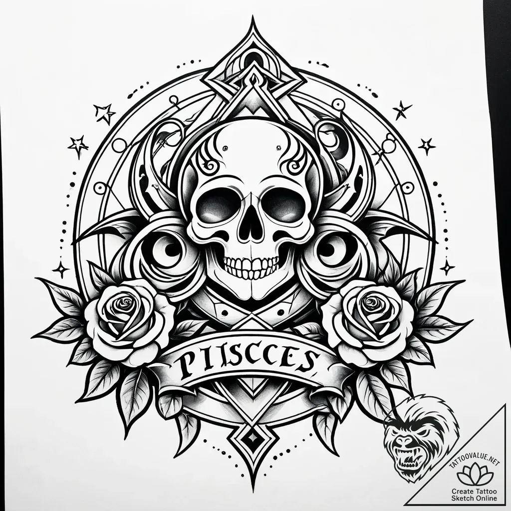 The Pisces symbol, often depicted as two fish swimming in opposite directions, represents duality, intuition, and empathy – core traits of those born under this sign. Coupled with the skull, a universal symbol of mortality and transformation, and the roses, signifying love and beauty, this design speaks to a profound understanding of life's cyclical nature and the acceptance of both its light and shadow. It can embody a wearer's deep emotional intelligence, their artistic spirit, and their ability to navigate complex emotions.