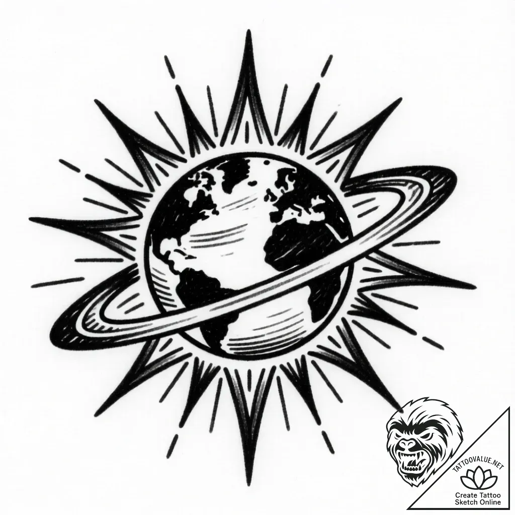 This neo-traditional sketch features a planet encircled by a cosmic ring, emanating sharp, radiant bursts like a celestial sun. The bold, heavy linework, reminiscent of classic woodcuts with a subtle Art Nouveau flair, conveys a sense of raw, protective energy. It's a graphic composition that feels both ancient and boldly modern.