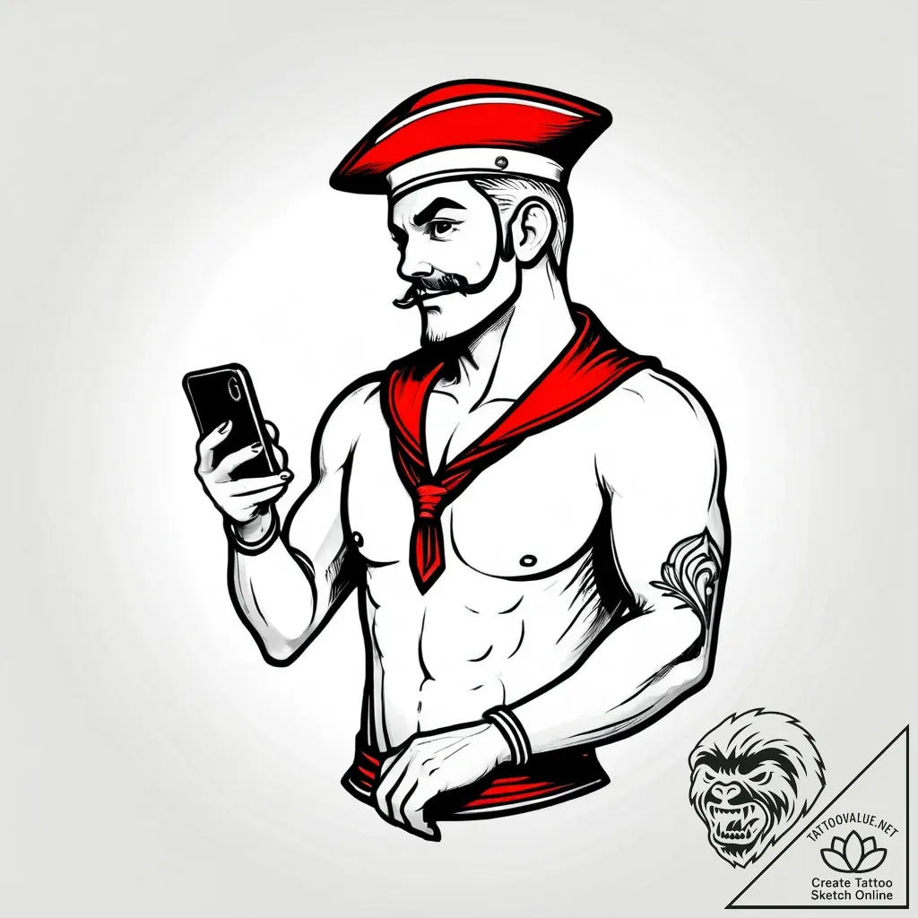 This tattoo sketch presents a delightfully anachronistic scene: a classic American Traditional sailor, rendered in bold black linework with striking red accents, completely engrossed in a mobile game on his smartphone. The composition is dynamic, capturing a moment of focused concentration, while the style evokes the golden age of tattooing – a robust, graphic aesthetic reminiscent of nautical flash sheets. It’s a playful collision of eras, a visual pun that’s both charming and unexpectedly modern.