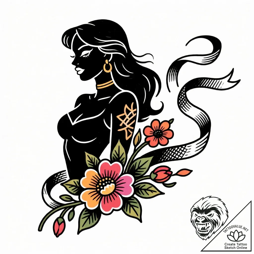 - Original User Request (RU): tattoo design: a silhouette of lada dancing gracefully, with flowers and ribbons trailing behind her. linework., concept art for tattoo, detailed cross-hatching shading, pen and ink hatching, new school tattoo style, vibrant colors, cartoonish, graffiti art inspired, exaggerated forms, on a clean white paper, isolated, black outline only, pure linework, no shading