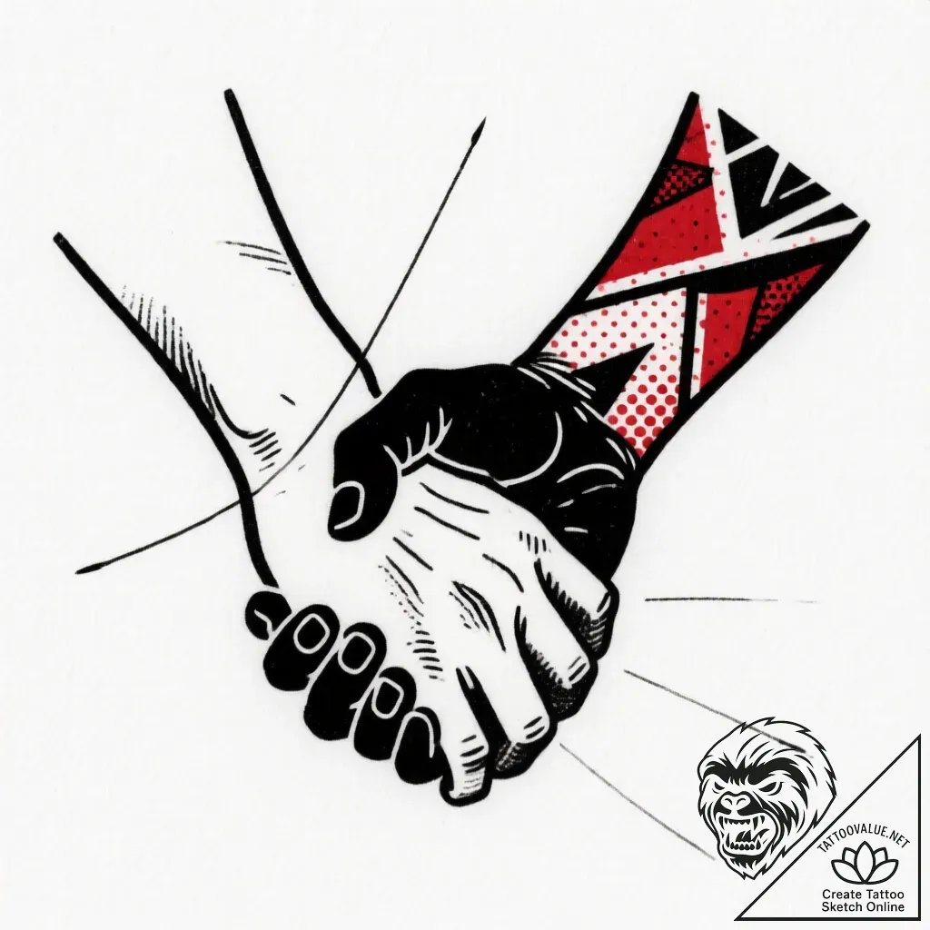 The clasped hands symbolize unity, trust, and unwavering support, representing a deep bond between individuals, be it romantic partnership, friendship, or family ties. The bold graphic elements, particularly the abstract geometric patterns on one arm, can signify strength, resilience, or a chosen identity, while the overall composition speaks to the enduring power of human connection.