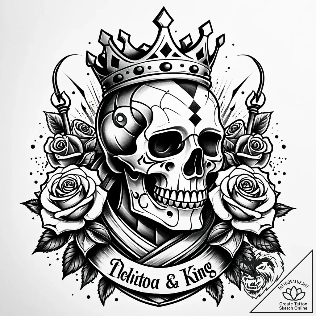 The crowned skull is a potent symbol of mortality and the transient nature of power, often representing wisdom gained through experience and a stoic acceptance of fate. The roses symbolize beauty and love, juxtaposed with the skull's mortality, suggesting that even in the face of death, life and passion endure. This design speaks to a personality that is strategic, resilient, and understands the profound balance between life and its inevitable end.